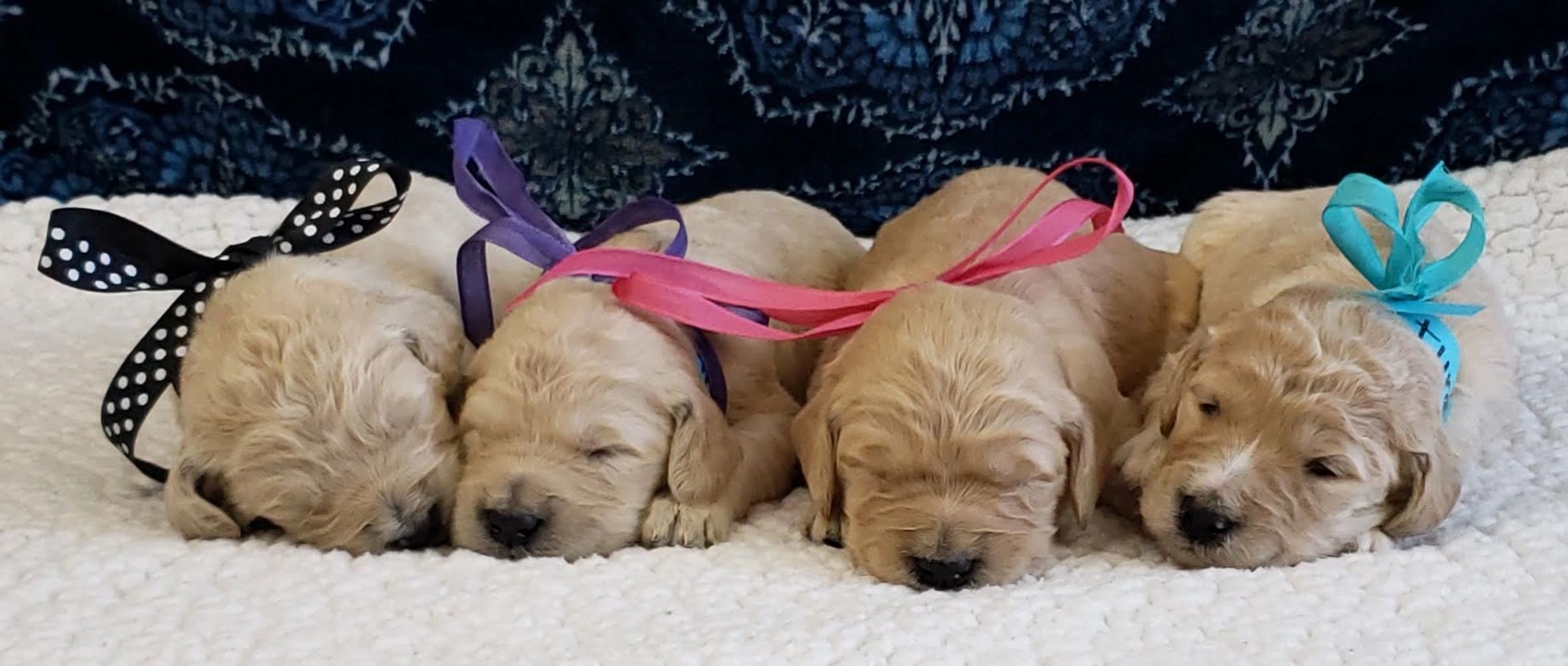 What do i need for my new puppy? You've come to the right place. Our golden retriever weighs 65 lbs and the stud is a 14lb miniature red. Did you know that our golden retriever parents are our own line of golden coat colors are: Goldendoodle babies are our specialty.